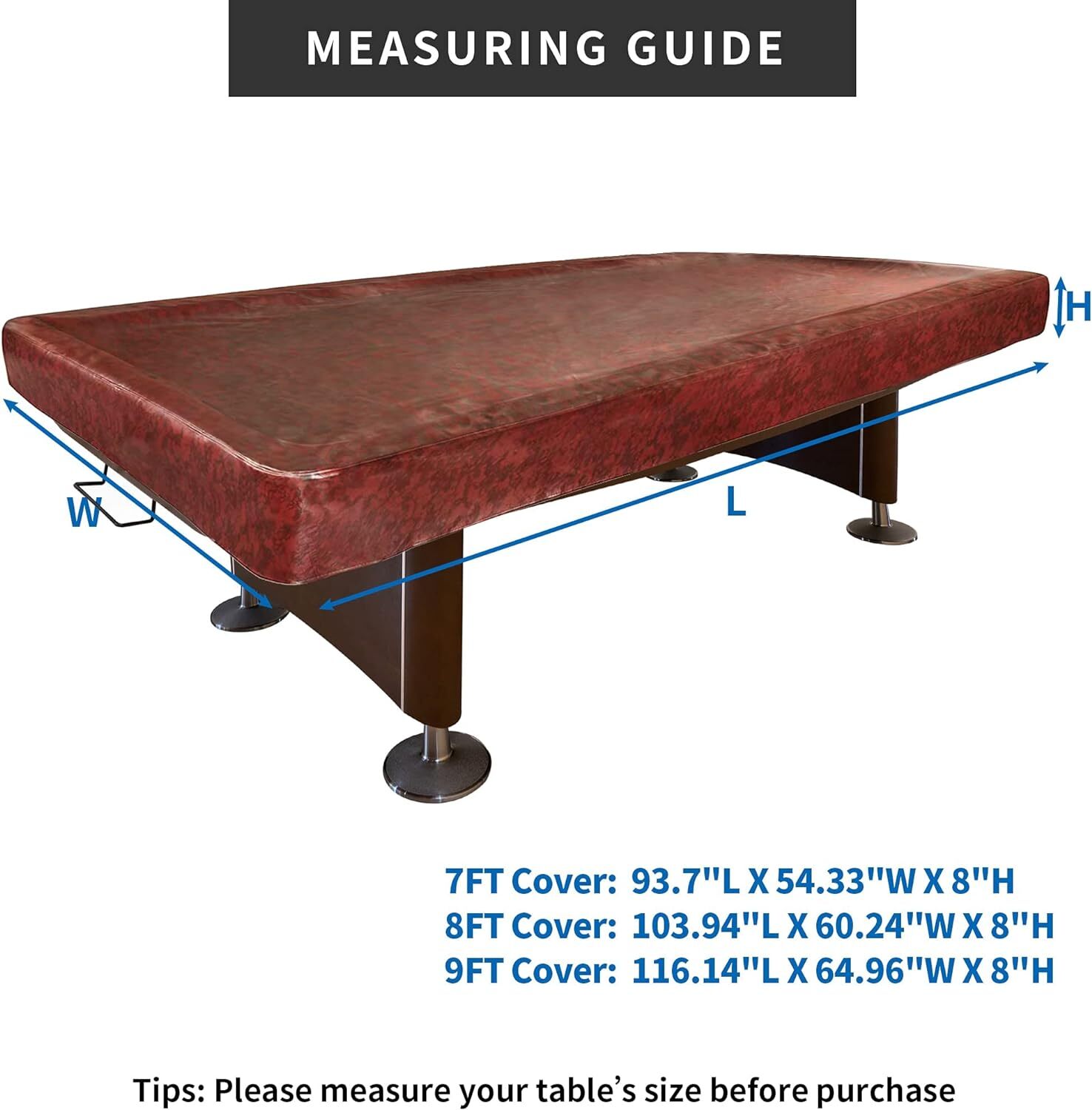 【9FT POOL TABLE COVER】: Cover dimension 116.14"L X 64.96"W X 8"H, side drape is 8" from the top. Fits most standard pool table 9 foot.Please firstly measure your pool table before purchasing.